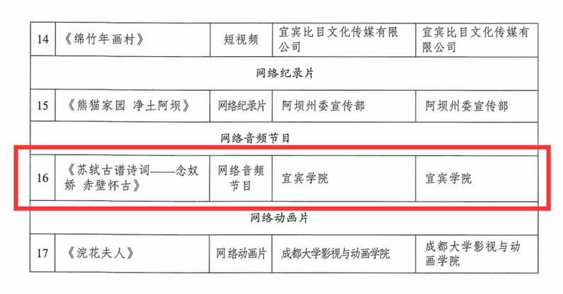 近日,四川省广播电视局公布了2023“时代光影 百部川扬”(神秘蜀韵 百部川扬)网络视听作品征集传播活动第四季度优秀作品名单,宜宾学院选送的网络音频节目《苏轼古谱诗词—念奴娇 赤壁怀古》获得优秀奖。