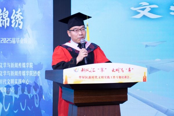 晚会在《青春组曲》中拉开帷幕,《同桌的你》《老男孩》《光阴的故事》三首经典歌曲唤起了同学们的青春记忆。随后,文新学院党委书记、院长高正伟上台致辞,将光阴故事融入话语缓缓诉说,向毕业生提出三点殷切嘱托:一是认真对待任务,脚踏实地做事,以责任感与敬业精神做好当下工作;二是坚守做人原则与底线,在复杂社会中守住善良、勇担责任;三是拥抱科技浪潮,保持理性自律,在技术洪流中守住专注、不忘初心。学生代表王鹏发言,深情言语间表达了对老师、母校的感激之情,深鞠一躬道尽四年栽培恩,对毕业生们也送出了最衷心的祝福:愿此去繁花似锦,再相逢依旧如初。