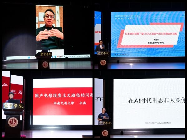 西南石油大学艺术学院院长焦道利教授分享了基于AIGC技术加持下的油气文化影像表达实践成果;宜宾学院文学与新闻传媒学院王黔教授以新媒体时代儿歌异化现象引出技术“赋权”下艺术生产的新变;《北京电影学院学报》吴冠平主编倡导重视艺术作品中人类情感的人文主义创作,以机器为载体创造出一种新的生命体征,理解、提升审美意识;西南交通大学人文学院安燕教授则提出国产电影现实主义路径所存在的问题和其发展的可能性;西南政法大学新闻传播学院韩晓强副教授聚焦AI时代重思非人图像,讲述了“非人摄影”的概念以及相关案例;四川师范大学影视与传媒学院谢建华教授从电影叙事概率革命切入,剖析智能技术对艺术审美与创作逻辑的影响。