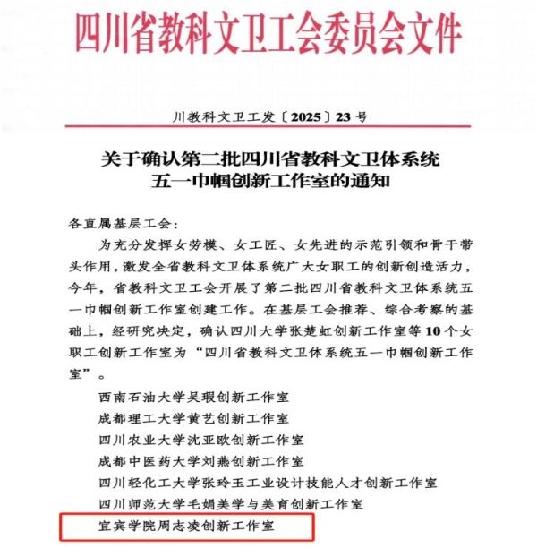 近日,四川省教科文卫工会正式发布《关于公布第二批四川省教科文卫体系统五一巾帼创新工作室名单的通知》,宜宾学院周志凌创新工作室成功入选四川省教科文卫体系统五一巾帼创新工作室。