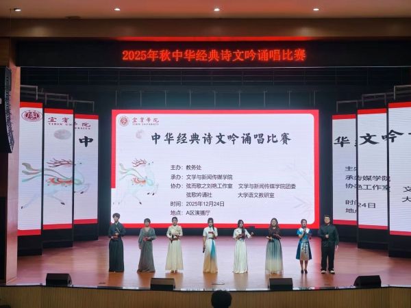 为传承中华优秀传统文化,感悟经典诗文的不朽魅力,宜宾学院于12月24日下午在A区演播厅隆重举办了2025年秋季中华经典诗文吟诵唱比赛。本次比赛由宜宾学院教务处主办,文学与新闻传媒学院承办,弦而歌之刘艳工作室、文学与新闻传媒学院团委、弦歌吟诵社、大学语文教研室协办。本次比赛共有16支优秀团队参赛,他们以中华民族传统读书法——吟诵——展现了中华优秀传统文化的深厚内涵与艺术魅力。