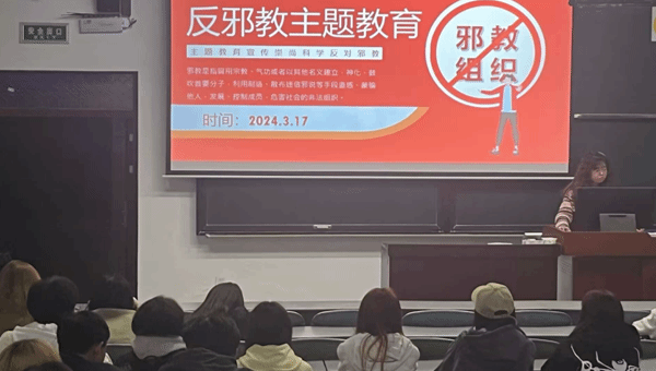 为加强学生的防范意识,增强识别邪教的能力,抵制邪教思想的侵蚀,树立正确的核心价值观,3月17日下午,文艺学部组织学生开展了反邪教主题教育。本次主题教育由学工办辅导员赵翔玥主讲。