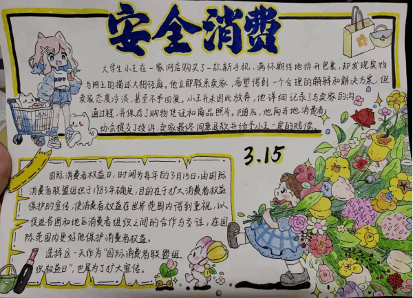 活动通过线上广泛宣传,号召在校学生积极参与,以书画方式促进消费法律知识的普及,宣扬维权意识。手抄报由各班宣传委员统一上交,再由评委组进行严格的审核和评选。本次参赛的手抄报作品,图文并茂、主题突出、内容丰富、排版整齐美观,营造了良好安全消费氛围。评委们结合作品的创意性、艺术性、主题契合度等方面进行了客观公正的打分,最终评选出一等奖1名、二等奖2名、三等奖3名、优秀奖4名。