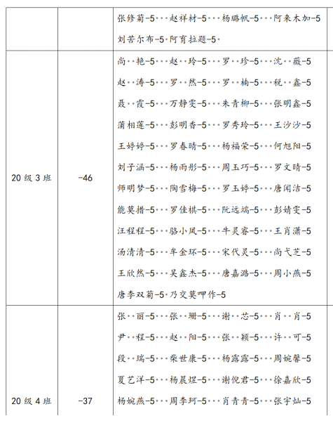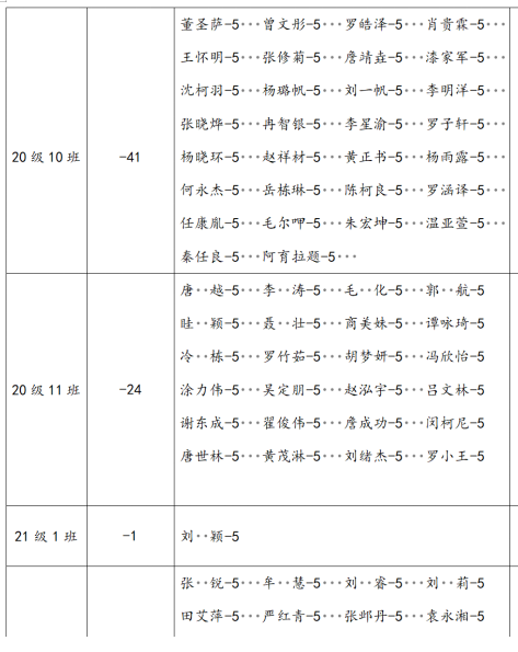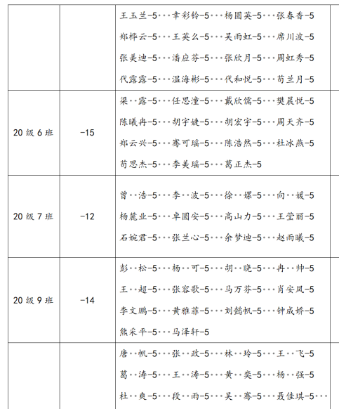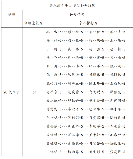 1. 在2023-2024学年下学期第八周青年大学习中,以下班级出现未学习的情况,情节恶劣;据细则,每人每次扣除个人操行分5分,并扣除所属班级量化分1分。具体名单如下: