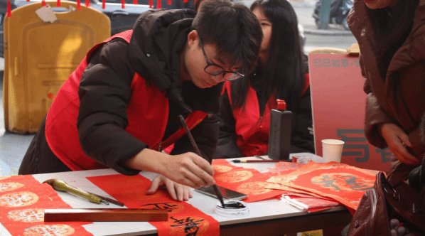 活动现场,宜宾学院文学与新闻传媒学院的同学大展身手,挥毫泼墨书写春联。一行行俊逸的书法,一句句祝福的话语,寄托着大家对新年的美好期盼。同学们创作的春联不仅饱含着深厚的文化底蕴,更传递出浓浓的新春祝福,居民们纷纷前来欣赏同学们的书法创作,并挑选自己喜爱的春联,现场气氛热烈而温馨。