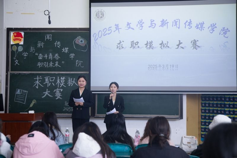 为增强同学们的就业意识,明确职业定位,3月19日,文学与新闻传媒学院在硕勋楼B201举办了“奋斗青春·职引未来”求职模拟大赛。文新学院党政办主任巫颖、学工办主任罗立、广播电视学教研室主任董海琴、创新创业系统分管老师唐纯丽、专职辅导员吴琴和赵翔玥担任比赛评委。