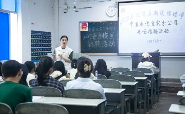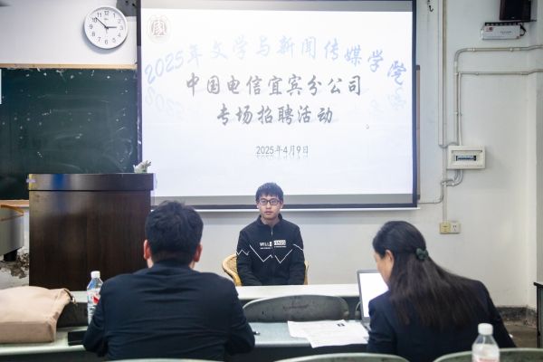 为拓宽2025届毕业生的就业渠道,提高就业质量,4月9日,文学与新闻传媒学院在初心楼205举办了中国电信宜宾分公司专场招聘活动。文新学院学工办主任罗立、就业辅导员吴琴到场为同学们提供专业指导,2025届未就业毕业生参加了招聘活动。