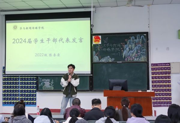 随后,学工办老师依次为2024届团委学生会干部颁发聘书并宣读了2025届干部名单。陈奎霖代表2024届团委学生会发言,他全面回顾了过去一年团委学生会在思想引领、活动开展、服务同学等方面的工作成果,分享了工作中的经验与感悟,并对学院领导老师的悉心指导和全体成员的辛勤付出表示衷心感谢。易星余代表2025届团委学生会进行发言,她表示将以身作则,带领大家共同进步,将团委学生会的各项事务落实到位。