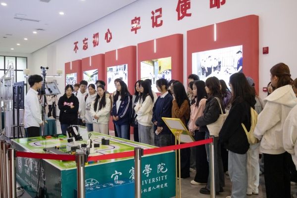 活动中,师生们通过专题展陈的图文资料和实物展示,重点学习习近平总书记来校视察时的重要指示精神。大家在求实会堂大厅观看了学校发展视频,从“回望忆足迹、当下展风貌、期待向未来”三个维度,全方位感受学校紧跟时代步伐、稳步发展的成长历程。随后,同学们在专业讲解员的带领下,依次参观了模拟垃圾智能分类运输机器人展台、智慧农业物联网环境监控系统、油樟萃取精馏展区及就业创业指导服务展区,深入了解学校在科技创新、人才培养与就业服务领域方面的实践成果。