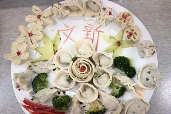 活动以“创意饺子”为主题,文新学子充分发挥专业特长与人文素养,将文学灵感融入传统美食。在同学们手下,饺子不仅是食物,更成为情感的载体与想象的延伸:有的以“金鱼”“荷叶”之形呼应诗词“鱼戏莲叶间”意象;有的巧妙捏出“小兔子”形象,造型满含童趣;有的合作包出花团锦簇的饺子,以捏塑巧思传递文新大家庭的团圆暖意。带队老师与同学们并肩创作,在轻松互动中交流近期学习生活情况,叮嘱大家在期末阶段合理安排时间,注意防寒保暖,融融暖意随笑语弥漫。