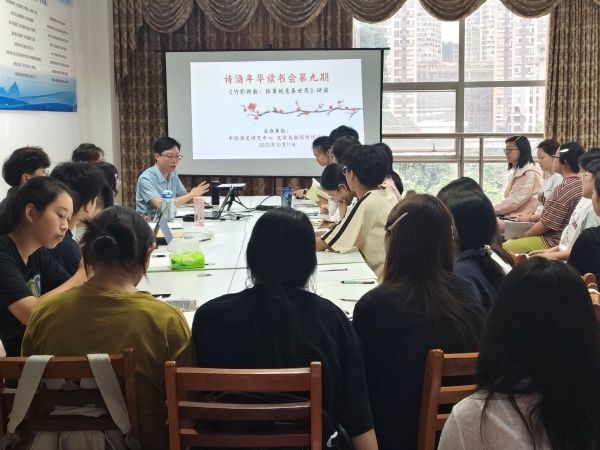 秋意浓,桂香飘,宜宾学院图书馆内书香氤氲。10月11日下午,文学与新闻传媒学院联合中国酒史研究中心举行的“诗酒年华读书会”在A区图书馆412中国酒史研究中心研讨室举行。活动由唐炳湟老师主持,陈利、李东昀、袁慧等老师以及汉语言文学专业三十余位同学到场参加。本次活动以学术著作《竹影鲸歌:杜甫的意象世界》为核心研讨书目。